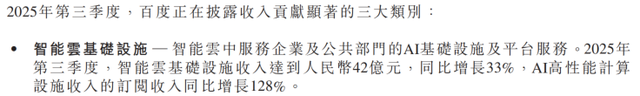 2025年第三季度,百度首次披露AI业务营收约百亿,同比增长超50%,其中智能云基础设施营收42亿元,同比增长33%,AI高性能计算设施营收的订阅营收同比增长128%。包括百度文库、百度网盘及数字员工等软件产品的AI应用营收26亿元,同比增长6%。包括智能体及数字人的AI原生营销产品及服务营收28亿元,同比增长262%。这一亮眼数据背后,是百度对AI业务的重新梳理和重点倾斜。