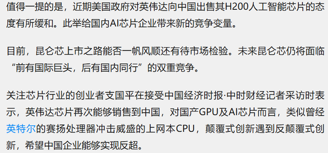 随着英伟达高端芯片重新进入中国市场,昆仑芯等国产芯片企业将面临更激烈的竞争。