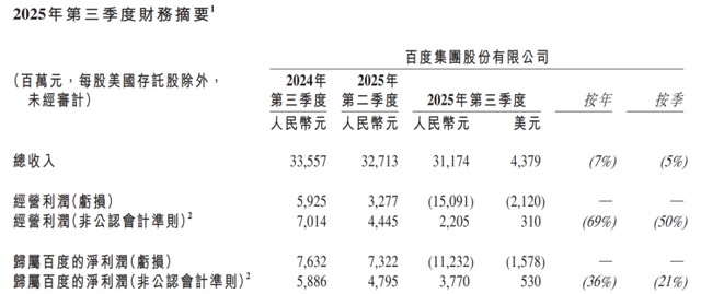 2025年第三季度,百度实现营收312亿元,同比减少7%,这已是连续两个季度收入下滑;非公认会计准则下的净利润37.7亿元,同比下降36%。