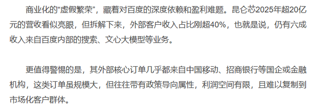 实际上,昆仑芯的业绩高度依赖百度体系。据《新浪财经》等报道,在昆仑芯2025年超20亿元的营收中,仍有六成收入来自百度内部的搜索、文心大模型等业务。这种关联交易的存在让人不禁质疑昆仑芯业绩的真实含金量。
