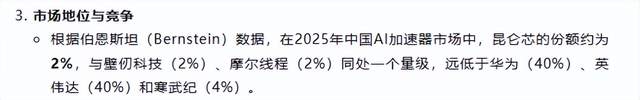 然而,市场挑战不容小觑。据伯恩斯坦数据显示,在2025年中国AI加速器市场中,昆仑芯的份额约为2%,与壁仞科技、摩尔线程同处一个量级,远低于华为(40%)和英伟达(40%)。