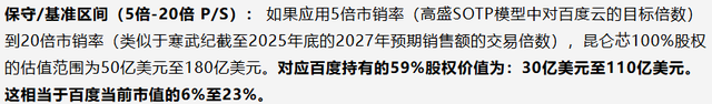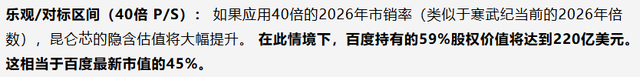估值方面,高盛研报指出,如果市场给予昆仑芯类似于寒武纪的估值倍数(40倍市销率),百度持有的59%股权价值将高达220亿美元,相当于百度当前总市值的45%。