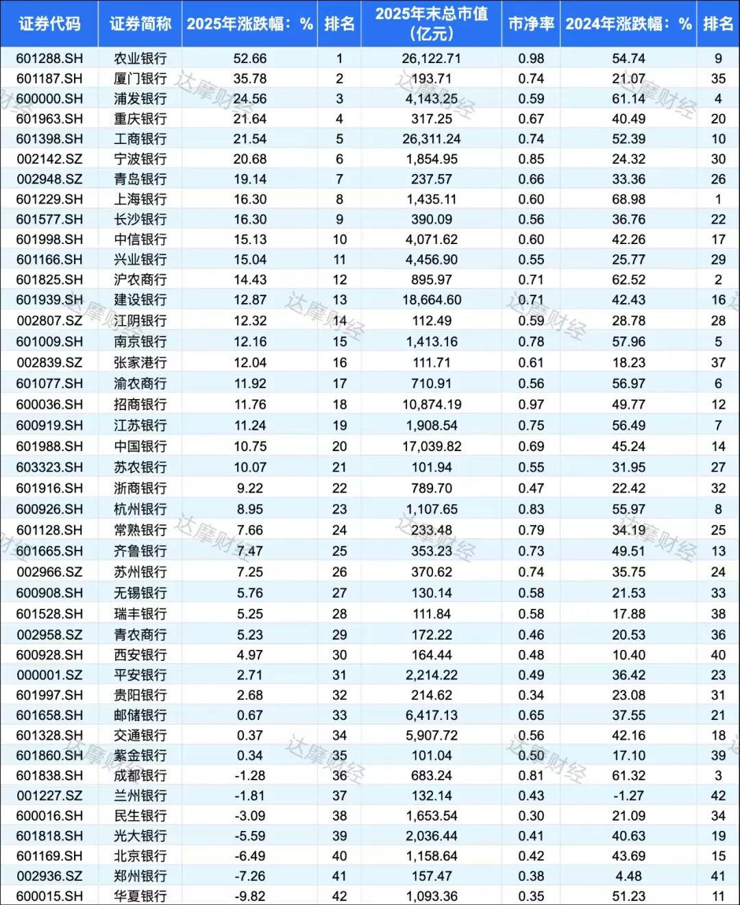 聚焦个股表现,42家A股上市银行中,33家收涨、9家收跌,其中,仅厦门银行全年涨幅超越了2024年,其余41家银行均跑输去年。如此的股价表现与2024年相比逊色不少。
