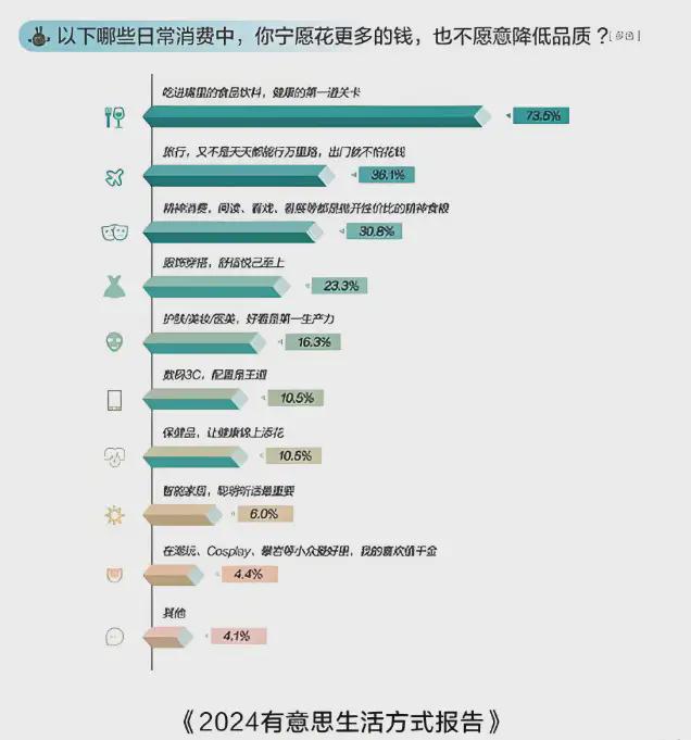 《2024有意思生活方式报告》表明,73.5%的消费者在食品饮料选择上,倾向于多花钱保证品质。