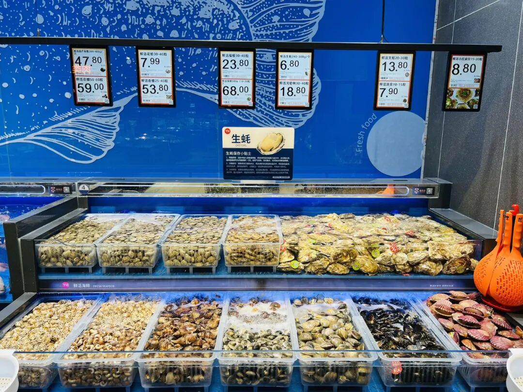 服务体验的升级贯穿于各个环节:肉禽柜台提供切丝、切片、绞肉等免费加工;海鲜区支持专业的清洗、宰杀、打氧等处理。更有多处细节体现人文关怀:食百货架旁配备放大镜,方便年长顾客查看;连卷袋处设置湿手器,便于取用;散装食品区标注“一斤约多少个”,让购买更直观;试鞋区提供一次性袜套,确保卫生;收银台备有免费应急耗材,解顾客不时之需。食品安全管控严格,鲜切水果执行“468”时间管理原则,超过4小时打八折,超过6小时打六折,超过8小时下架,部分叶菜、肉禽、水产实行“日清打折”,全力守护消费者“舌尖上的安全”。