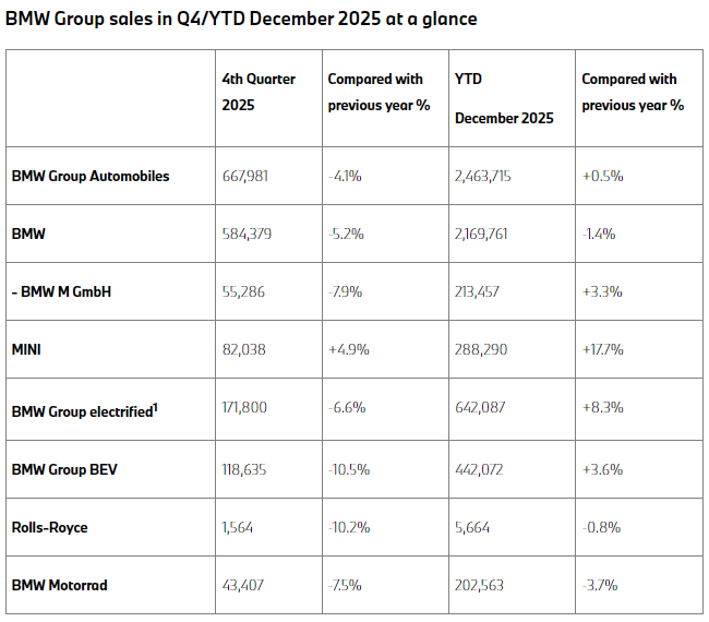 2025年第四季度,宝马集团遭遇年底“翘尾”失灵,单季度总销量同比下降了4.1%;BMW品牌同比下降5.2%,MINI品牌同比增长4.9%,劳斯莱斯品牌同比下降10.2%。