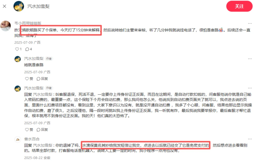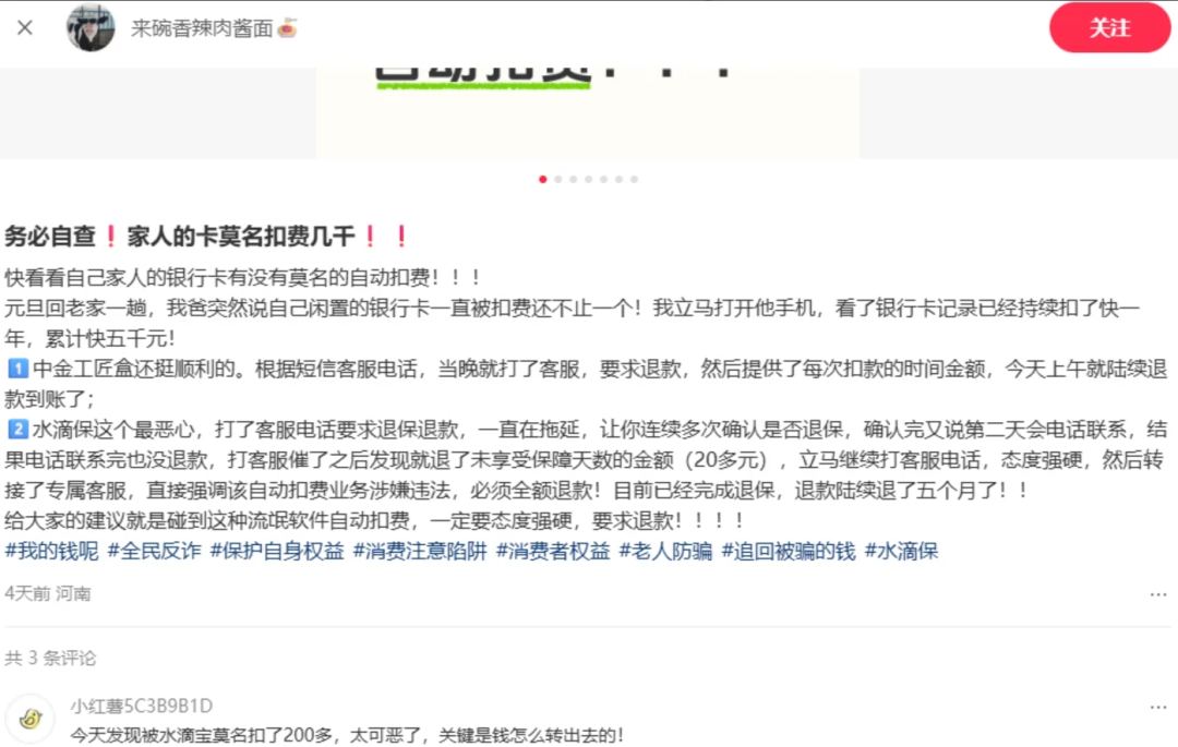 在小红书和微信公众号上,也有无数人分享类似经历。有人发现自己“被投保”了根本不知道的保险;有人发现亲人去世后,扣费居然还在继续……