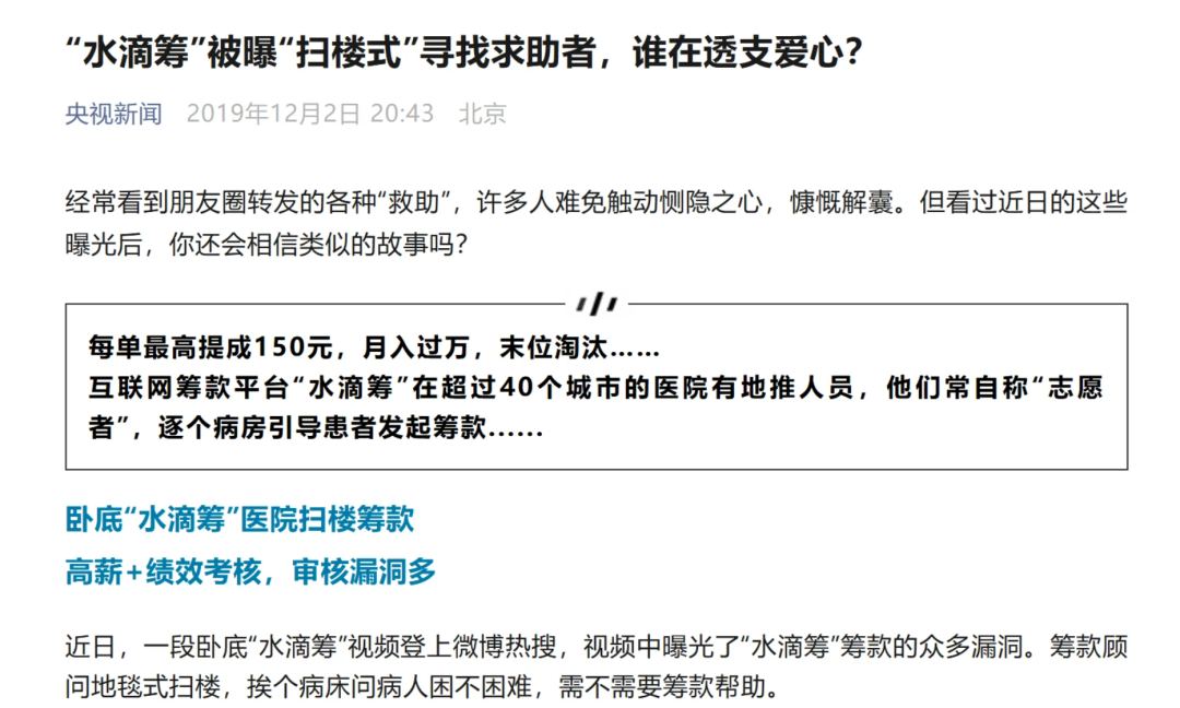早在2019年,水滴筹就被曝出,“扫楼式”寻找求助者,挨个病床问病人困不困难,需不需要筹款帮助,主要目的就是为保险导流。