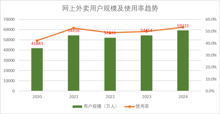 2024年末,我国网上外卖用户规模达5.92亿人,占网民总数的53.4%,渗透率持续提升并已覆盖过半网民。在接近6亿用户的规模下,若排除年龄层与消费习惯的影响,基本意味着外卖市场已趋近饱和。此时的市场竞争必将陷入存量博弈,而无法拉动市场整体增长。