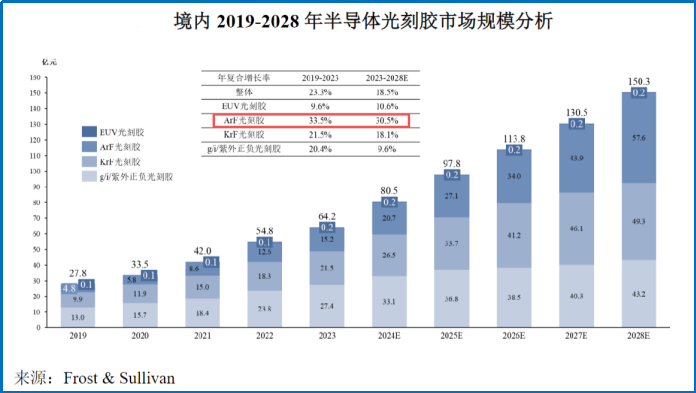 行业测算,到2028年我国境内半导体光刻胶市场规模有望达到150亿元,其中ArF光刻胶对应市场规模49.3亿元,占比达32.8%。