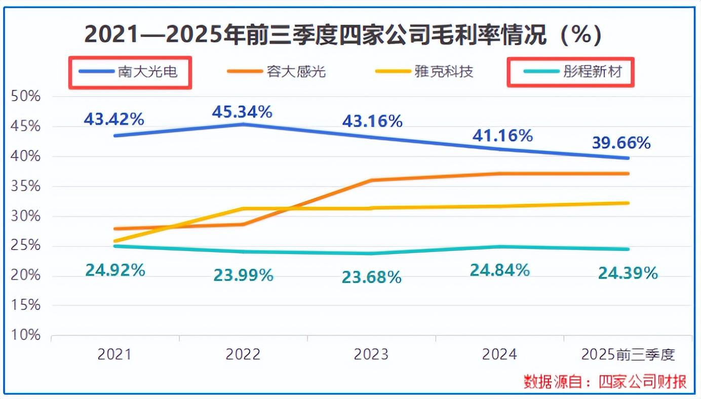 2021-2025年前三季度,南大光电的毛利率始终稳定在42%左右的较高水平,而彤程新材同期毛利率仅在23%上下,两者之间形成了近19个百分点的差距。
