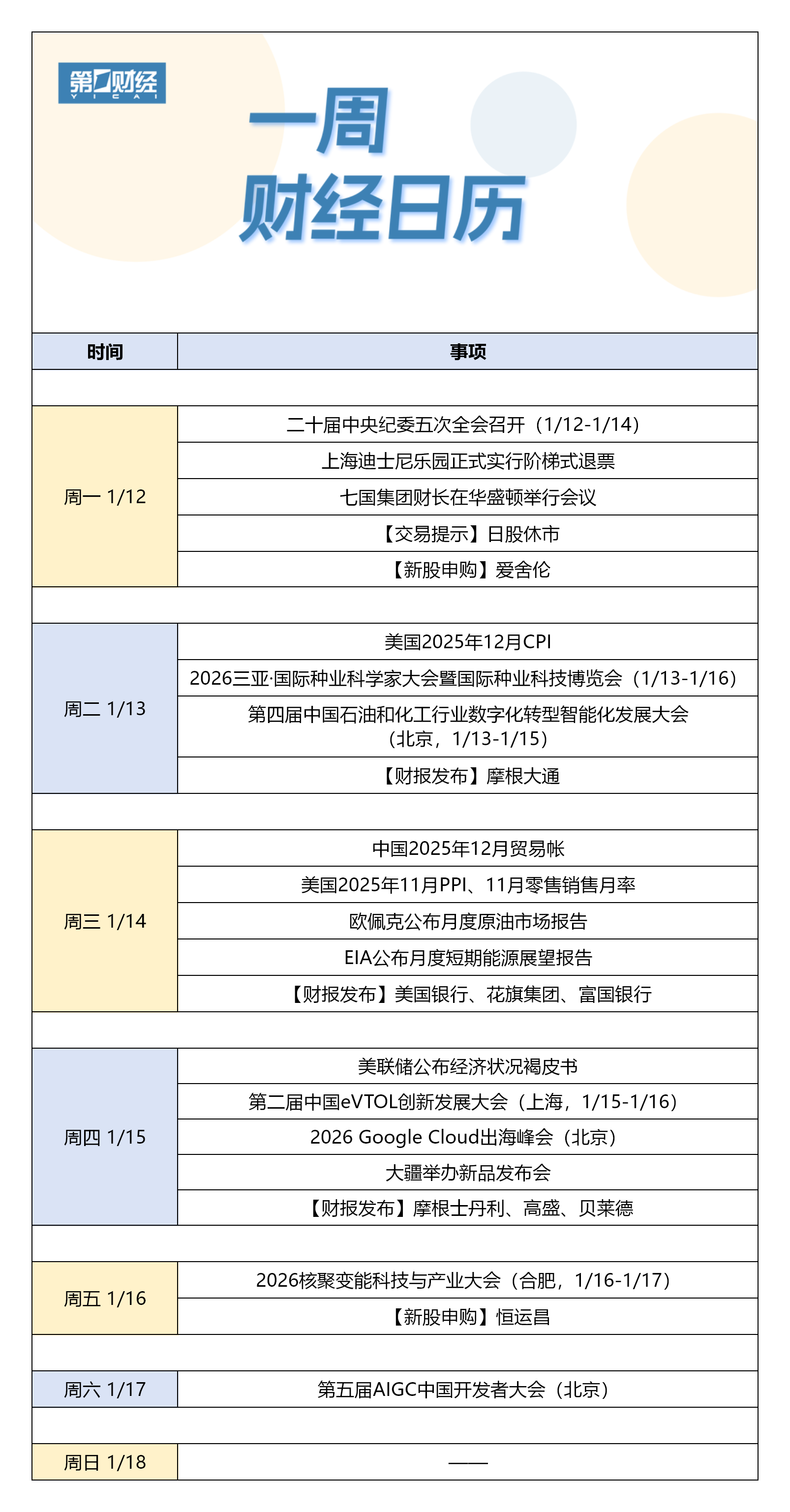下周财经日历(1月12日-1月18日)