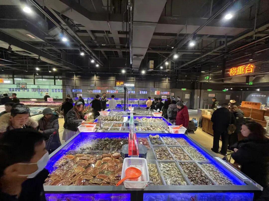 肉品水产区,永辉天津SM店的禽类、牛羊、冷鲜水产等都预包装标品化售卖了,相关的一些营运标准也能落地,比如,评判活鲜水产区有没有做好,有两个重要标准:1、消费者在活鲜水产区的外沿区,不能闻到腥味。2、活鲜区不能有面积水渍。