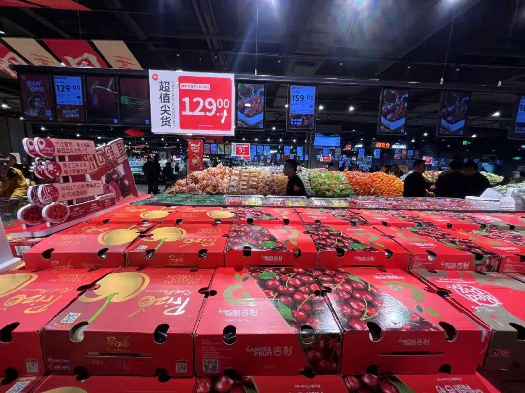 这一块,永辉的“大单品”经营意识也比较强,在年货市场即将到来之际,浆果类水果也进入到了消费旺季,永辉天津SM店就主打了三款大单品——蓝莓、车厘子、草莓,这三款商品的春节消费心智很强,在年货季,消费者基本都会买。永辉则看起来备货不错,货源充足,规格和价格理想,永辉的蓝莓做的是佳沃的18mm大果规格;车厘子5斤装双J产品则卖129元。