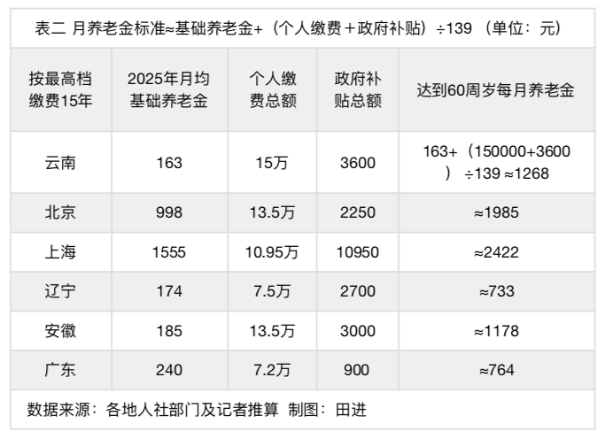 如表二,如果个人从2026年开始按农民养老金上限缴费15年,北京、上海的农民养老金每月至少可达1985元/月、2422元/月,云南、安徽也都能突破1000元/月。