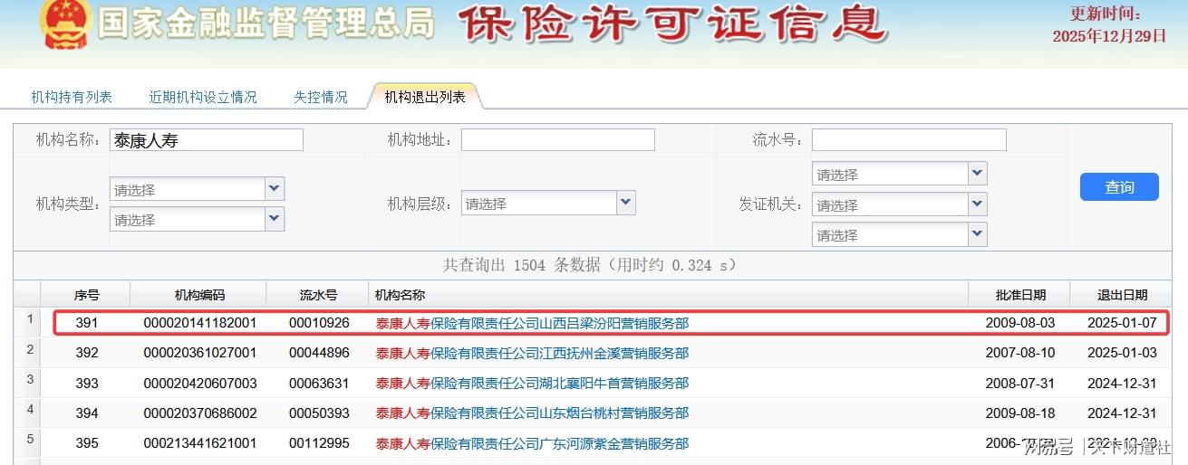 泰康人寿2025年还启动了大规模机构“瘦身”,此举也备受市场关注。根据金融监管总局网站显示,泰康人寿2025年共计撤销超过390家分支机构。