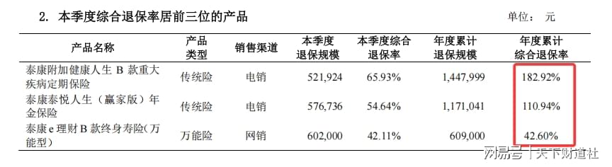 更为引人关注的是,泰康人寿部分产品退保率较高。2025 年三季度偿付能力报告显示,泰康人寿的“附加健康人生 B 款重大疾病定期保险”产品年度累计退保率高达 183%,同时还有另有两款健康险产品的年度退保率也分别达到 111%和 42%。