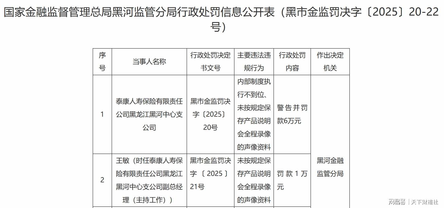 12月10日,泰康人寿黑龙江黑河中心支公司因内部制度执行不到位、未按规定保存产品说明会全程录像的声像资料被国家金融监管总局黑河监管分局处罚。