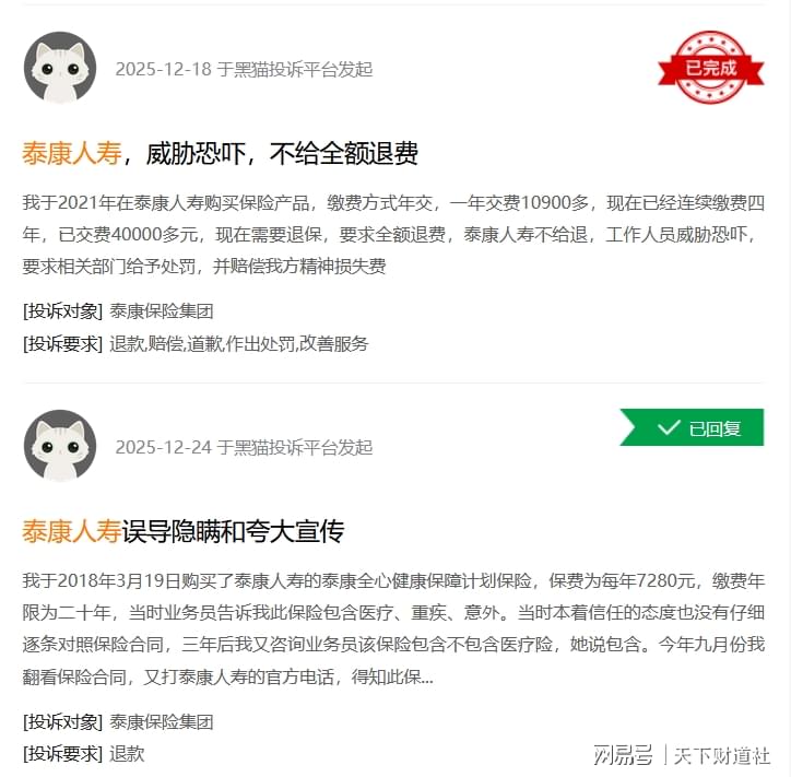 此外,根据最新统计数据,在黑猫投诉平台上,对泰康人寿的投诉累计超过5400条。其中有不少是关于误导消费的投诉。如有用户表示接到泰康人寿的推销电话,业务员隐瞒、夸大收益,无故扣钱且拒接电话等等。