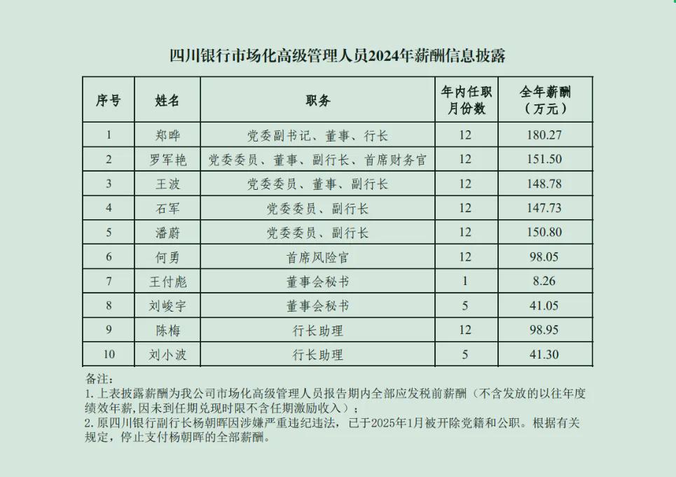 上述薪酬为2024年度全部应发税前薪酬,不含发放的以往年度绩效年薪,因未到任期兑现时限不含任期激励收入。值得注意的是,原四川银行副行长杨朝晖因涉嫌严重违纪违法,已于2025年1月被开除党籍和公职,根据有关规定,停止支付杨朝晖的全部薪酬。而2023年度披露信息曾标注,杨朝晖的有关问题尚待最终处理。