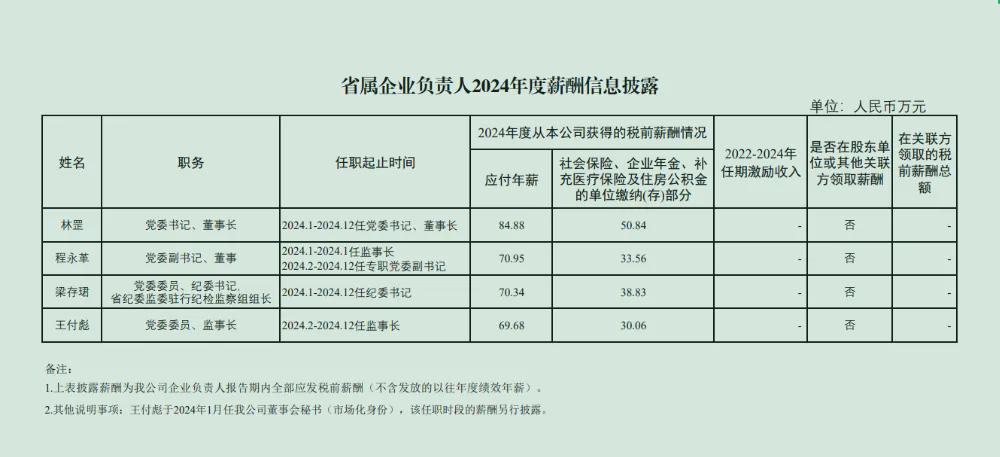 省属企业负责人4人,包括党委书记、董事长林罡,党委副书记、董事程永革,党委委员、纪委书记,省纪委监委驻行纪检监察组组长梁存珺,党委委员、监事长王付彪,其中林罡应付年薪84.88万元,社会保险、企业年金、补充医疗保险及住房公积金的单位缴纳(存)部分50.84万元,合计135.72万元。