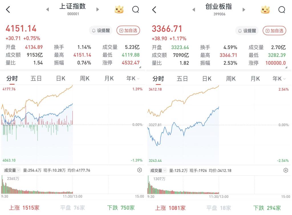 至午间收盘,上证综指涨0.75%,报4151.14点;科创50指数涨2.26%,报1509.29点;深证成指涨1.31%,报14305.1点;创业板指涨1.17%,报3366.71点。