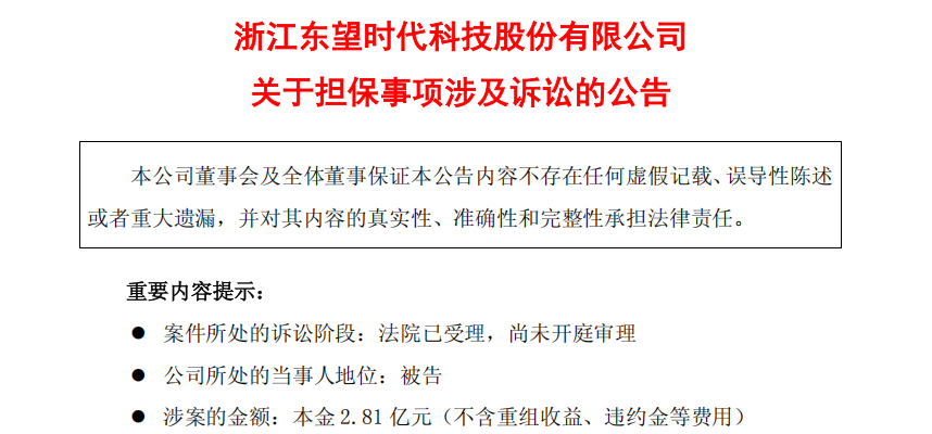 1月9日,东望时代(600052.SH)发布公告称,公司于1月8日收到浙江省东阳市人民法院送达的《应诉通知书》等法律文书,因公司为杭州益荣房地产开发有限公司提供担保而未按约定履行支付义务,被原告东阳市金投股权投资管理有限公司(以下简称“金投投资”) 提起诉讼,对多项诉讼请求承担连带清偿责任,涉案本金2.81亿元。