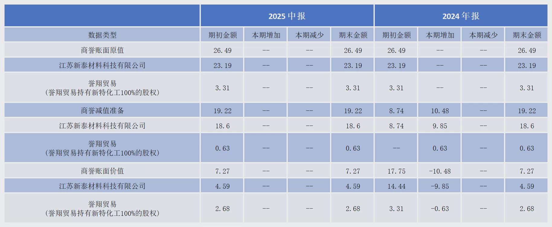 2024年,行业低谷时,公司计提商誉减值准备10.48亿元,直接导致当年巨亏13.61亿元。其中,因六氟磷酸锂盈利能力下降,对新泰材料计提商誉减值9.85亿元;因新特化工未完成承诺业绩,计提商誉减值0.63亿元。