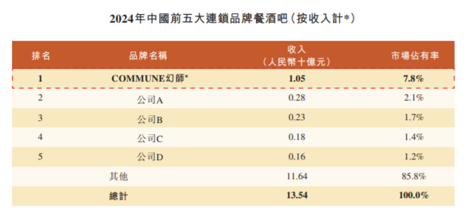 根据弗若斯特沙利文的资料,2022年至2024年以营业收入计,COMMUNE幻师连续三年在中国餐酒吧品牌中位列第一。