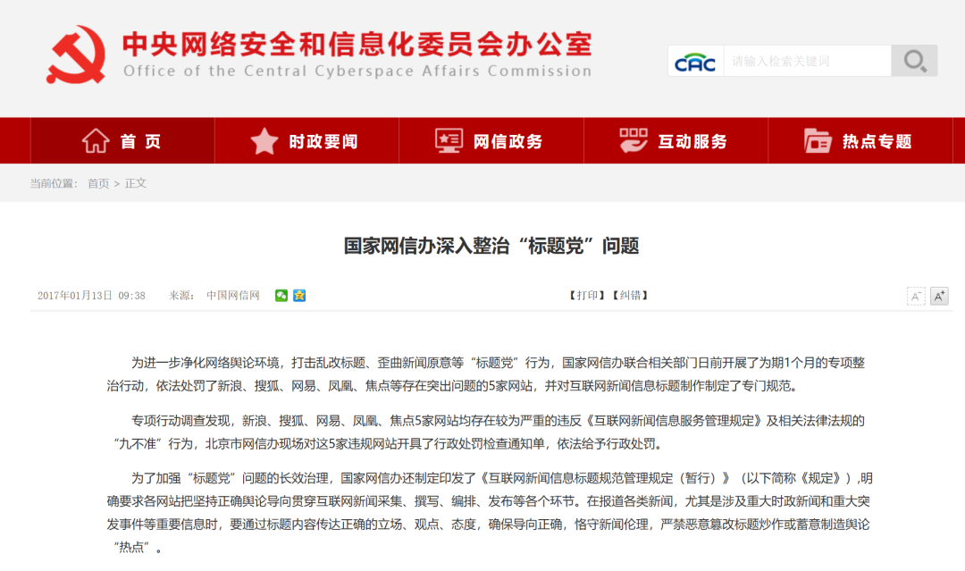 2017年,国家网信办制定印发了《互联网新闻信息标题规范管理规定(暂行)》对新闻信息标题进行严格规定,严禁恶意篡改标题炒作或蓄意制造舆论“热点”。《互联网新闻信息标题规范管理规定(暂行)》全文如下: