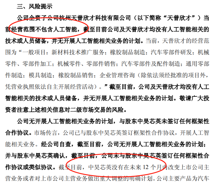面对股价异动,公司12月30日在风险提示公告中表示,公司无开展人工智能相关业务的计划,与股东中昊芯英未签订任何框架性合作协议,不存在应披露而未披露的重大信息。