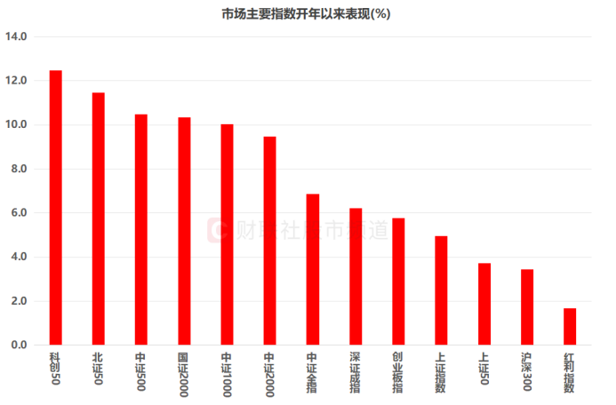 具体数据来看,在开年以来的行情中,主要指数均获上涨。其中,科创50、北证50表现最为亮眼,涨幅分别达12.5%、11.5%,而红利指数、上证指数、创业板指则相对平淡,同期涨幅均未达到全市场个股涨幅中位数的水平。若仅统计规模指数,代表中小盘股的中证500、国证2000、中证2000涨幅均超10%,而上证50、沪深300等权重股指数涨幅靠后。