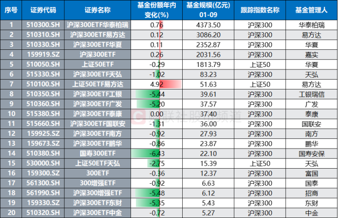 注:基金规模居前的上证50、沪深300系ETF年内份额变动情况(截至1月9日数据)