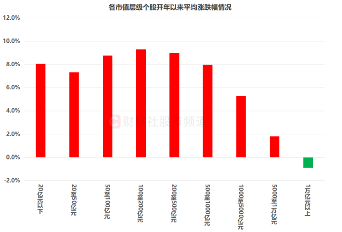 注1:各市值层级个股开年以来平均涨跌幅情况(截至1月12日收盘)注2:总市值以2025年12月31日数据统计