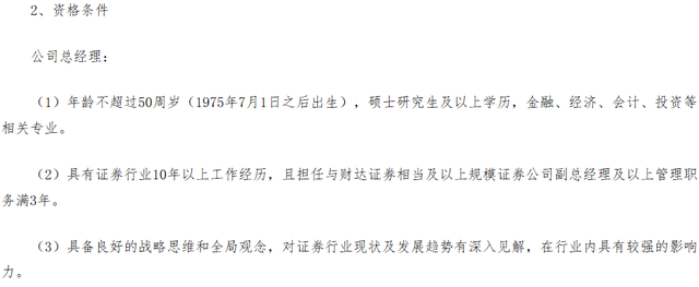 对总经理人选的要求是,不超过50周岁,研究生及以上学历,具有证券行业10年以上工作经历,且担任与财达证券相当及以上规模证券公司副总经理及以上管理职务满3年。