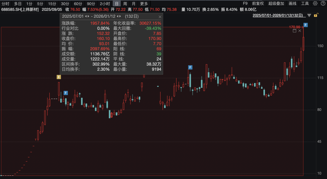 自2025年7月1日以来,上纬新材股价累计上涨近2000%。 截至1月12日收盘,该股涨超11%,报160.1元/股。