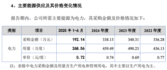 瑞尔竞达在2024年产能与产量双增长的情况下,电力用量却大幅下降。《招股书》显示,2022年-2024年,瑞尔竞达的产能从5.16万吨增长到5.33万吨,产量从4.14万吨增长到5.08万吨。