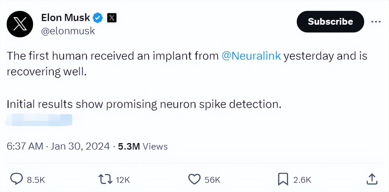“昨天,第一位人类患者接受了来自神经连接的植入手术,目前恢复良好。初步结果显示,神经元尖峰检测很有前景。”