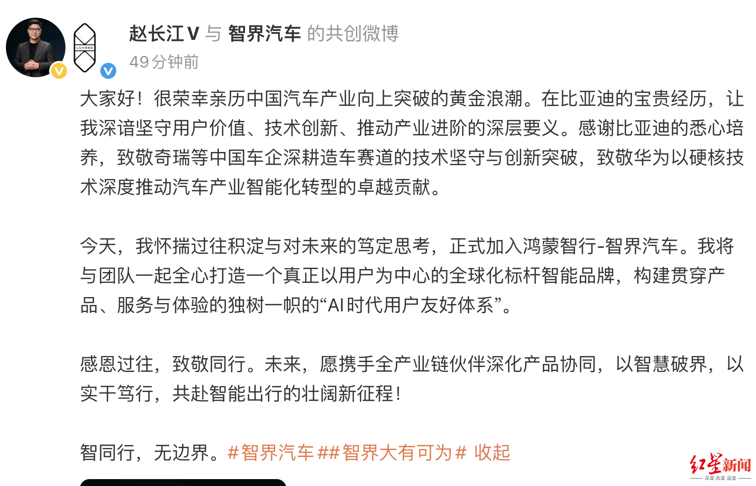 红星资本局1月13日消息,今日上午,前比亚迪高管赵长江发文宣布正式加入智界汽车。