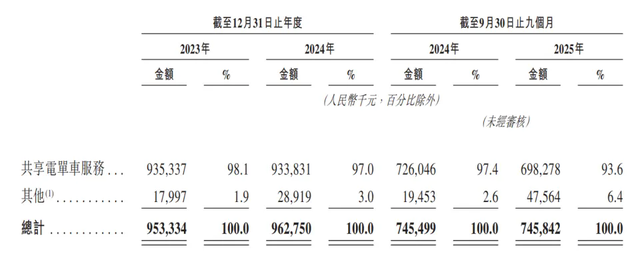 从财务数据来看,2023年、2024年公司营收分别为9.53亿、9.63亿元,经调整净亏损分别约为8008万元、4407万元,其中,共享电单车服务是公司的单一支柱业务,收入占比超过了93%,包含平台服务、广告服务在内的其他业务仅占6.4%。