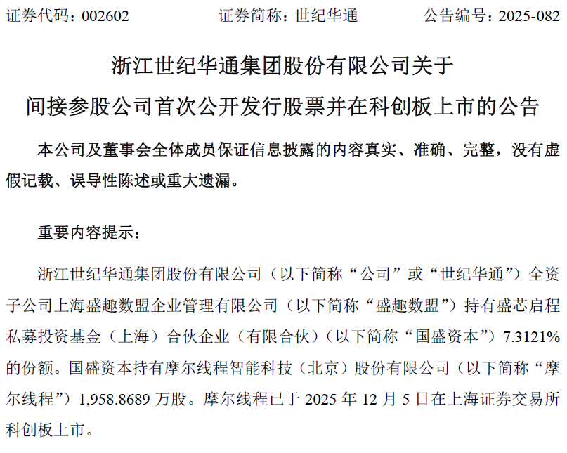 在摩尔线程早期投资者当中,有“A股游戏王”世纪华通(002602 SZ)的身影。根据世纪华通公告,公司全资子公司盛趣数盟持有盛芯启程私募投资基金(上海)合伙企业(有限合伙)7.3121%的份额。国盛资本持有摩尔线程1958.8689万股,国盛资本所持股份占摩尔线程首次公开发行前总股本的4.8968%,占摩尔线程发行后总股本的4.1676%。世纪华通还在公告中表示,因间接战投摩尔线程,预计2025年第四季度浮盈超6亿元。