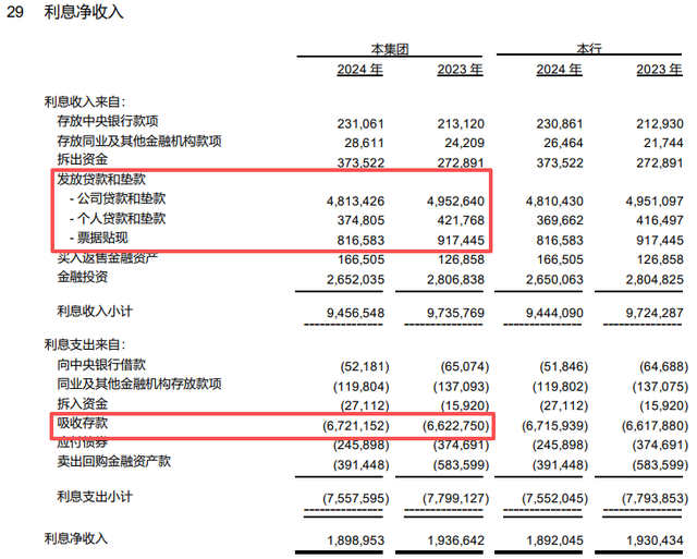 除了规模下降,山西银行还存在存贷款结构失衡现象。从贷款业务来看,截至 2024年末,山西银行发放贷款和垫款余额1749.13亿元(未含应计利息),其中公司贷款和垫款、票据贴现、个人贷款分别占比66.22%、27.02% 、6.76% 。在贷款中贴现资产占比较高,个人贷款业务贡献度较低。