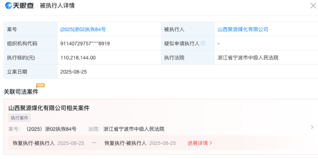 这并非山西银行股权首次遇冷。此前,2025年1月3日,该行第五大股东山西聚源煤化持有的1.9亿股股权,拆成4笔拍卖仍全部二次流拍。天眼查显示,山西聚源煤化已于2025年8月被浙江省宁波市中级人民法院列为被执行人,执行标的1.1亿元。
