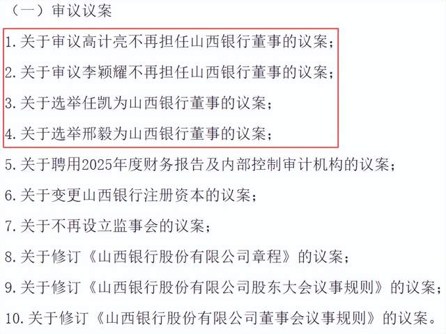除了行长之外,山西银行董事长也迎来变更。2025年11月24日,山西银行发布公告,将于12月10日召开临时股东大会,将审议10项议案。第2项、第4项与行长变更有关,审议李颖耀不再担任董事、选举邢毅为董事的议案。第1项、第3项与董事长变更有关,审议高计亮不再担任董事、选举任凯为董事的议案。