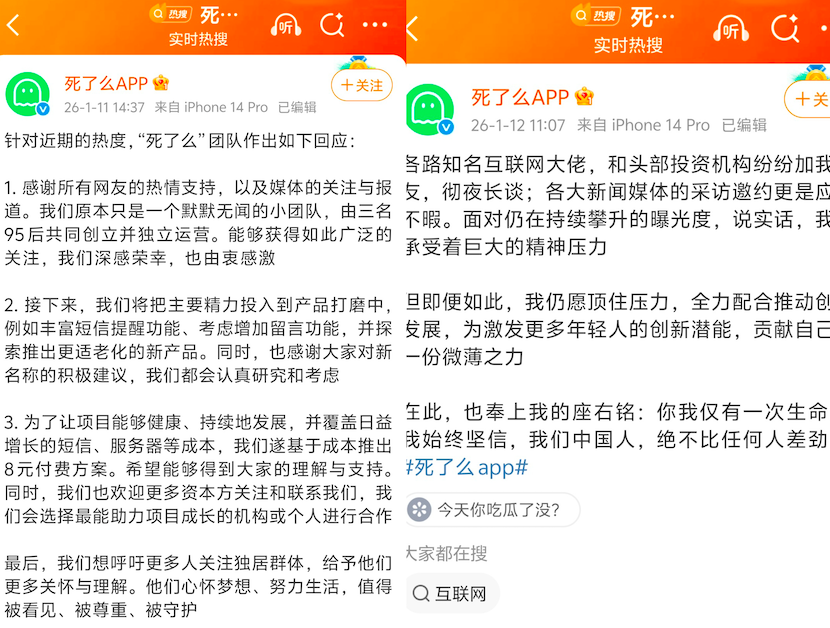 团队已经意识到问题。1月11日,“死了么”App通过官方微博回应,月底将上线短信通知、签到提醒功能,还计划推出适老化版本和留言功能。郭孟初也在微博表示,正在和互联网大佬、头部投资机构对接,融资还在洽谈中,本周内会有正式消息。但对于如何建立差异化优势,团队尚未给出明确方案。