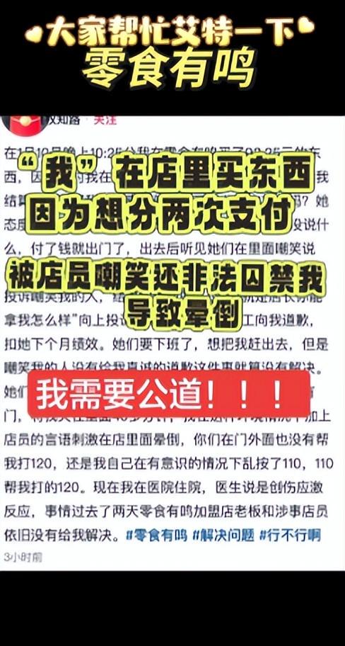 视频中,一名女子躺在病床上讲述,1月10日晚10时25分,她在零食有鸣商店购买了93.25元的商品,因发现有优惠券,故询问店员能否分两次支付。