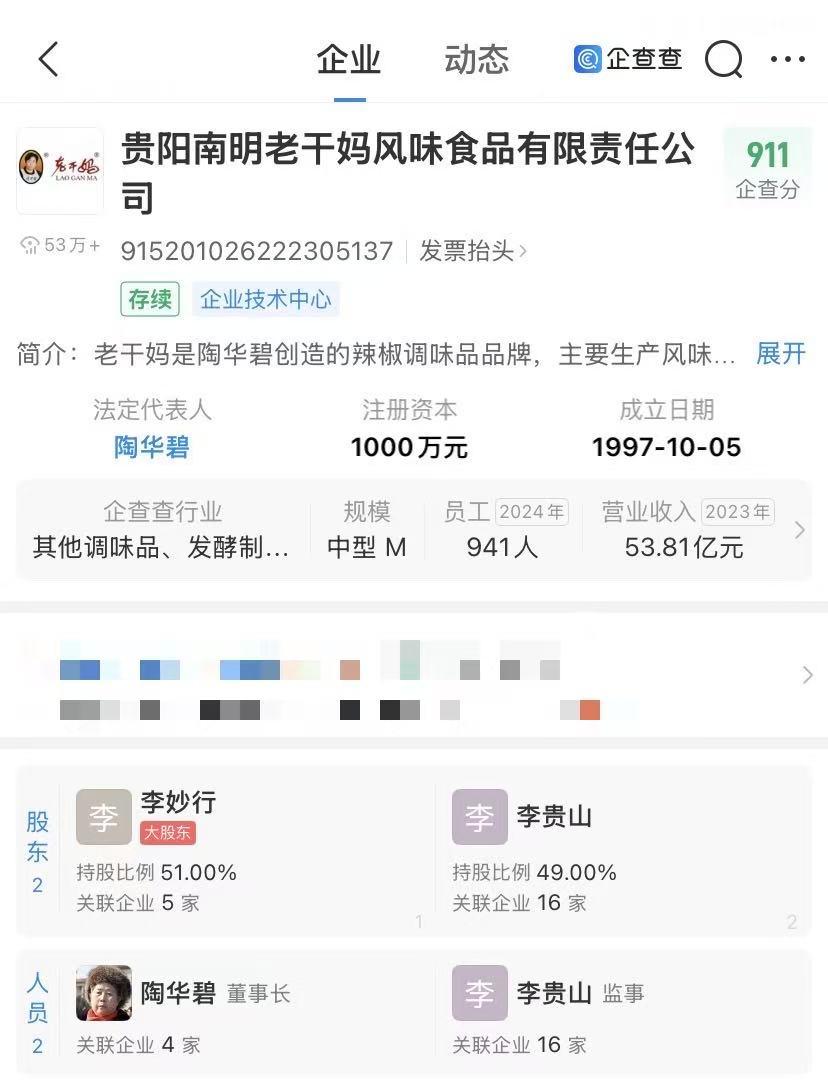 企查查APP显示,老干妈关联公司贵阳南明老干妈风味食品有限责任公司成立于1997年10月,法定代表人为老干妈创始人陶华碧,注册资本1000万元,由陶华碧之子李妙行、李贵山共同持股。