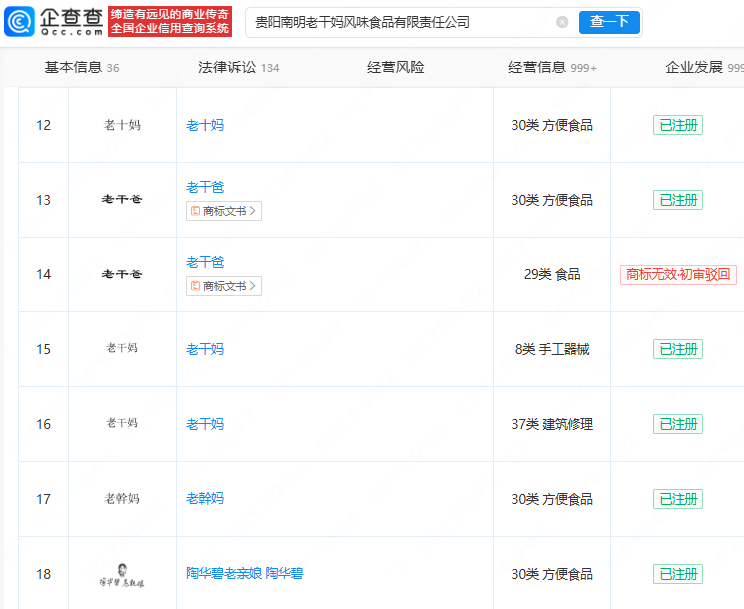 该公司对外投资贵阳南明老干妈风味食品销售有限公司。值得一提的是,围绕核心品牌“老干妈”,贵阳南明老干妈风味食品有限责任公司修筑了一条商标护城河,其已申请“老幹妈”“老十妈”“老干爸”“老干妈”等商标。