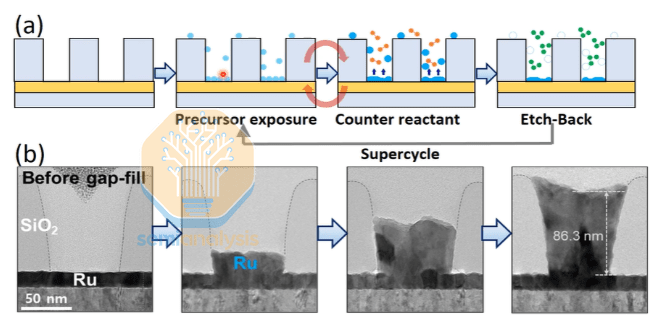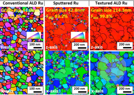 通过精心设计的“超循环”步骤,利用臭氧刻蚀去除侧壁上多余的晶核,实现完美的自下而上填充。更重要的是,沉积的钌在热处理后发生重结晶,最终形成近乎单晶的结构。这使得垂直电流方向与低电阻的c轴完美平行,从而最大限度地提高了器件的导电性能。