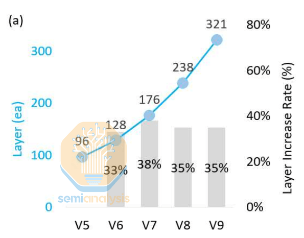 当每层刻蚀层数无法增加时,就必须增加刻蚀层数。这会增加大量的加工步骤。海力士表示,从V8到V9,总加工步骤增加了30%,蚀刻步骤增加了20%。WFE(晶圆级刻蚀)的拥趸们,别高兴得太早,层数增加的幅度接近35%,也就是说,层数的增长速度比加工步骤的增长速度更快。
